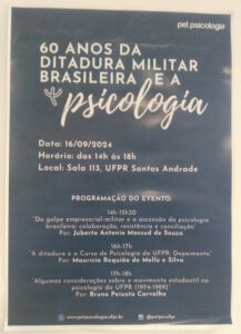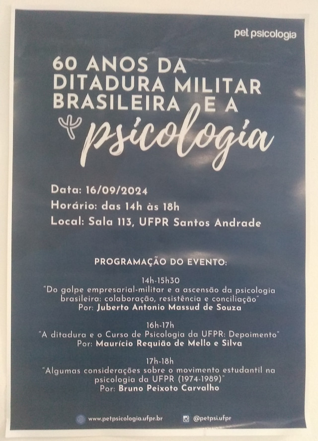 “60 anos da ditadura militar brasileira e a Psicologia” foi o título de um encontro realizado nesta semana (segunda-feira, dia 16), pelo Programa de Educação Tutorial Psicologia, da Universidade Federal do Paraná (UFPR).