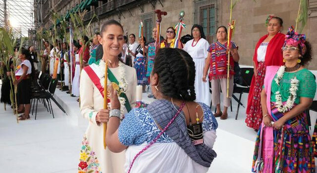Um dos momentos mais emblemáticos foi quando a nova presidenta recebeu de mulheres representantes de povos originários e afromexicanos o bastão que simboliza o comando da nação.