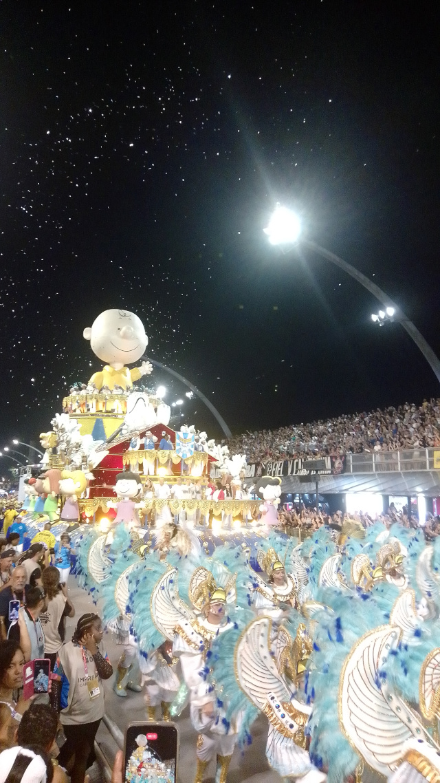 Na melodia, mais cadenciada, do refrão principal do samba-enredo, desfilantes da Águia de Ouro e o público cantavam a plenos pulmões: “Eh meu amigo Charlie/ Se você quiser eu posso até mostrar A força do canto da Vila Pompeia/ Brilhando de novo no Carnaval/ Ao som dos aplausos meu amigo Charlie Brown”.