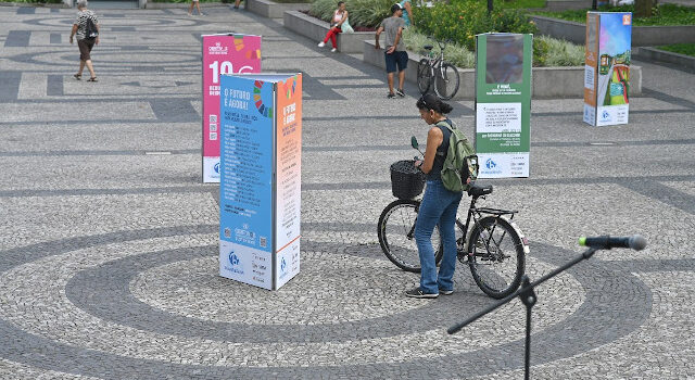 Imagem em destaque: totens em exposição na Praça Mauá. Foto: Henrique Teixeira/ Prefeitura de Santos. Demais imagens: totens em destaque. Divulgação