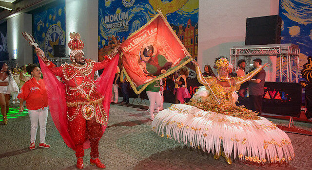 Imagem em destaque: casal de porta-bandeira e mestre-sala da Mocidade Alegre, no mini desfile da festa de lançamento dos sambas-enredos de 2026. Foto: Felipe Araújo/ divulgação Liga Independente das Escolas de Samba de São Paulo