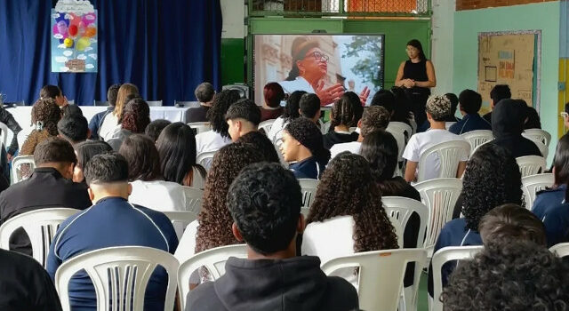 Imagem em destaque: exibição do documento “28 de fevereiro – a vitória da resistência” a estudantes da escola 28 de Fevereiro, no Saboó, em Santos. Foto: Instituto Telma de Souza
